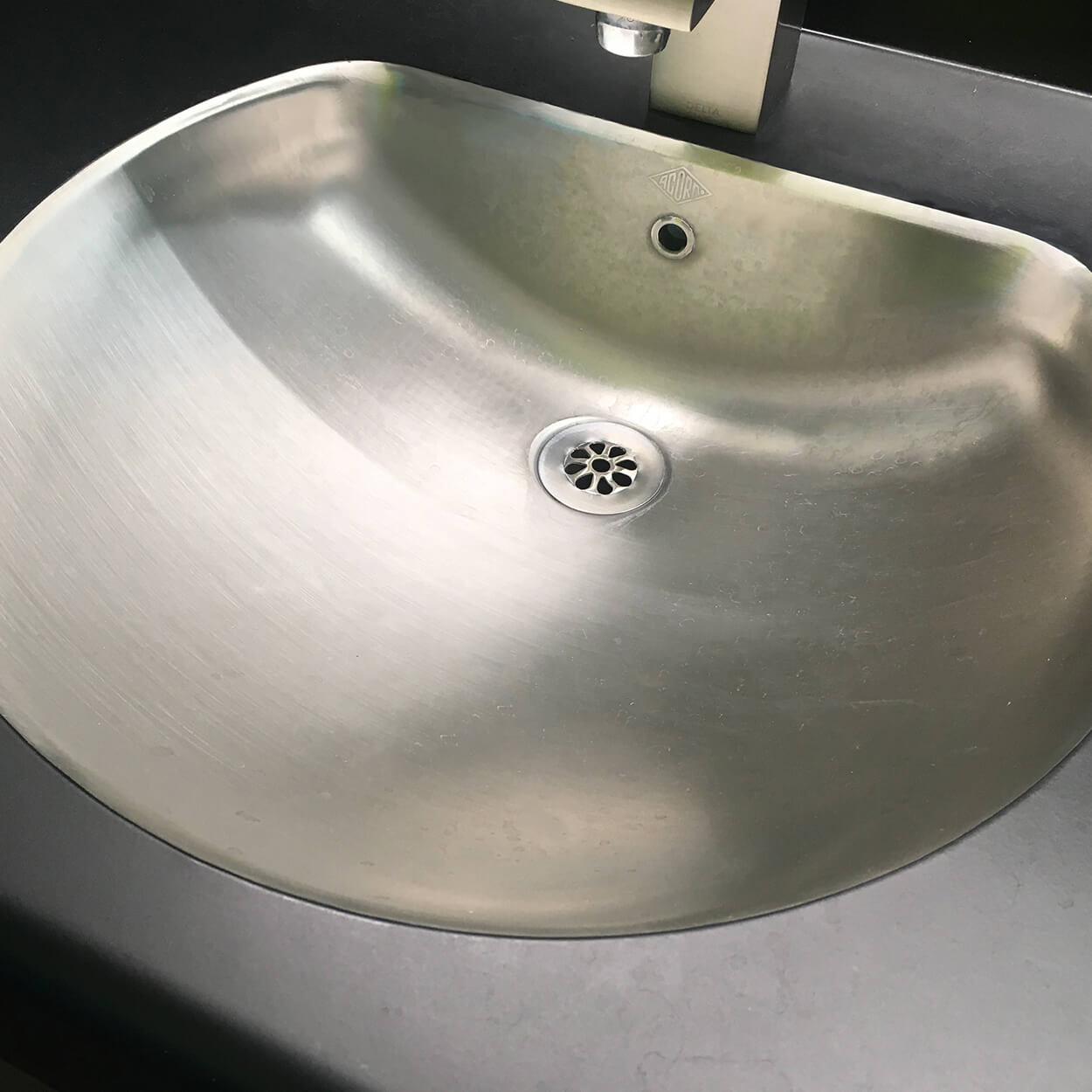 This provides a D-shaped bowl, 15-5/8" (397 mm) wide and 13-1/4" (337 mm) front-to-back, integrated into the stainless steel deck. The bowl can be provided in a Satin Finish (default) or high polish (RLD-HP).