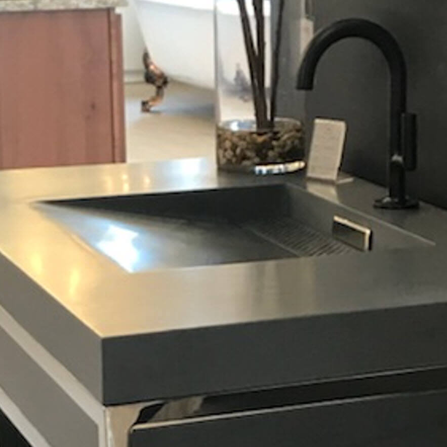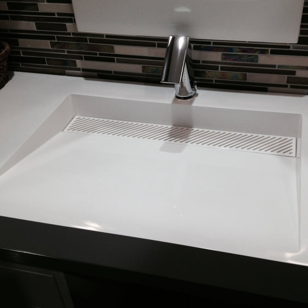 This option provides a rectangular ramp-shaped bowl integrated into the solid surface deck. The bowl measures 17" wide x 14" front-to-back x 4" deep (356 x 432 x 102 mm). The bowl features a ramp towards the from and gets deeper where the drain is. This bowl will be the featured bowl in however many stations the sink has. Each BBRA bowl on the sink will have a stylish slotted solid-surface drain plate.