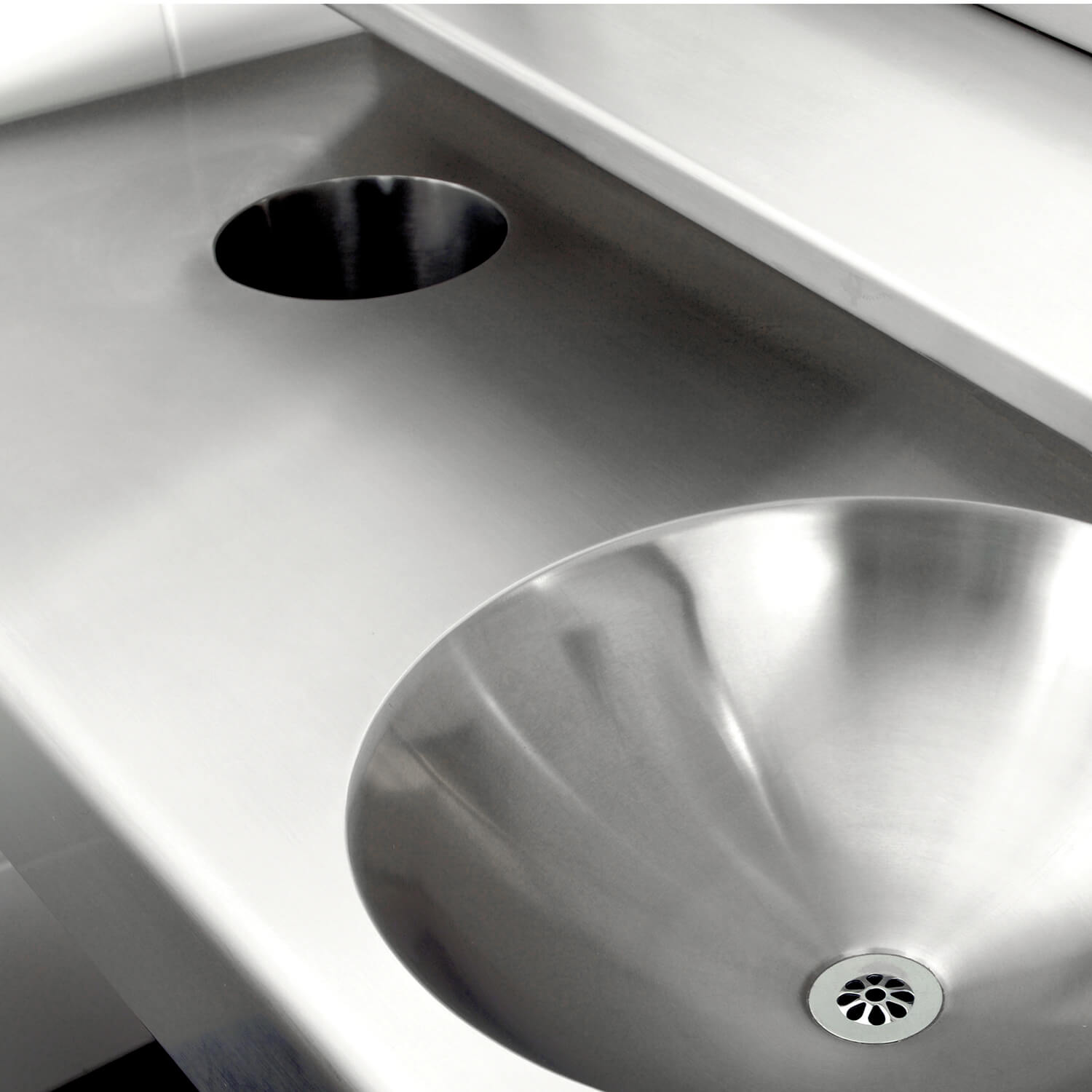 The stainless steel countertop is extended 18" (457.2 mm) on the left side of the fixture with a round waste hole and a tilt-out access bin.