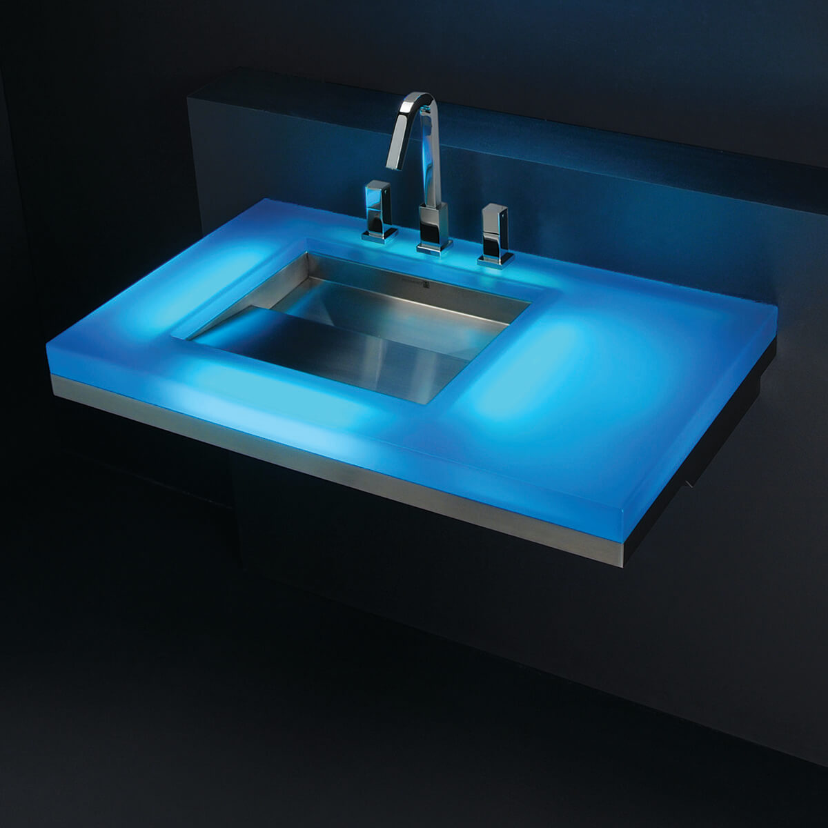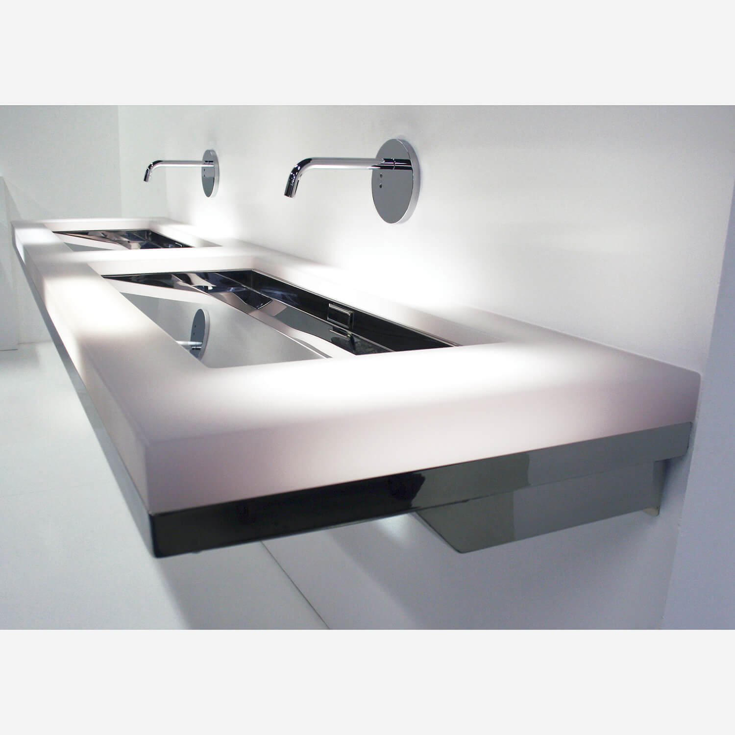 Ebb Wall Mount includes Models 9108-WM, 9110-WM, 9112-WM Combining the unique design of the EBB® basin with a cast resin countertop, the EBB Concept Wall-Mounted Deck provides a fixture that will highlight any bath or restroom. Standard units include models of 24", 36", or 55" (610, 914, or 1,400 mm) lengths. Using a translucent cast resin countertop, an often requested option for lighting is available.