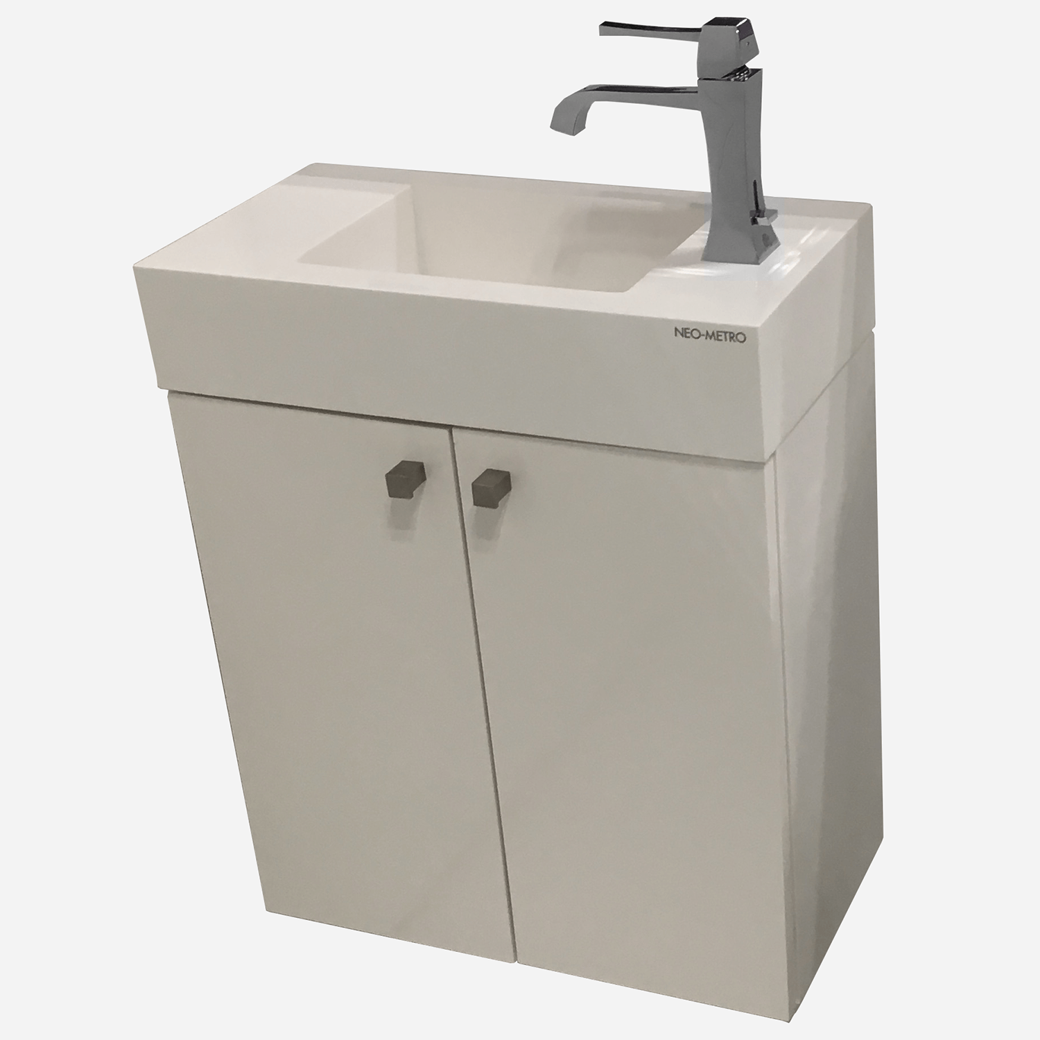 A small solid surface rectangular basin is designed to be mounted on the longer side with a left or right-side faucet (faucet provided by others). The focal product is a 7-1/8" x 10-5/8" x 4" deep (181 x 270 x 101.6 mm) rectangular bowl is integral to 4" high x 9-7/8" x 19-5/8" (101.6 x 251 x 498 mm) deck. Options include dual-tone using Neo-Metro's vibrant resin tops and a 20" (50.8 mm) tall solid surface cabinet.